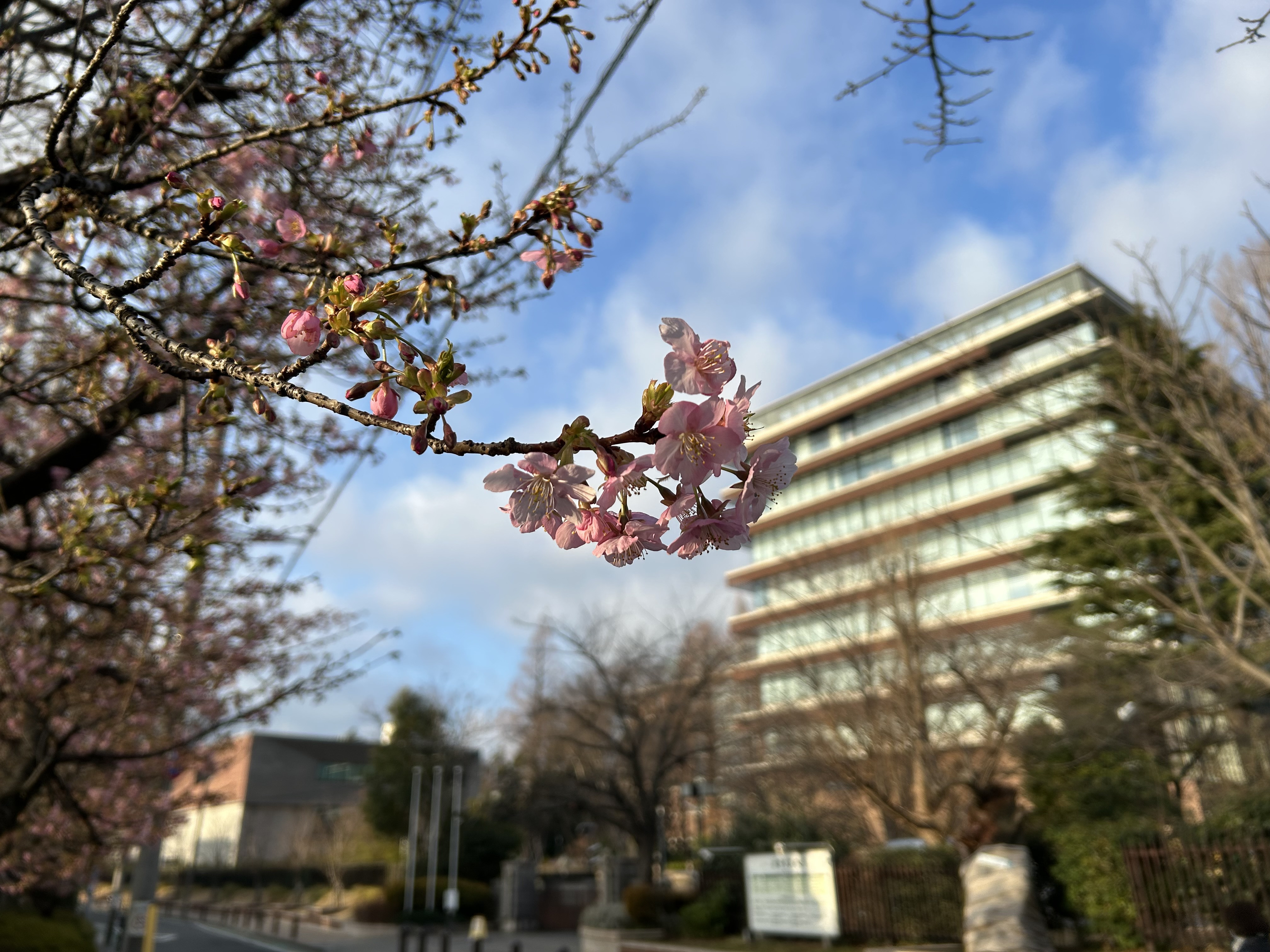 農大経堂門前、駒大高校土手の河津さくらが咲いています。